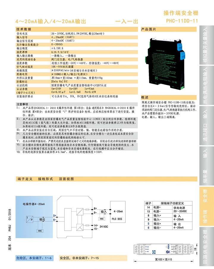 PHC-11DD-11 隔离式操作端安全栅, 将安全区4~20mA信号传送到危险区,驱动现场的阀门定位器、电/气转换器等执行机构工作。 电源、输入、输出三端隔离。 本产品需要外接20~35VDC电源。