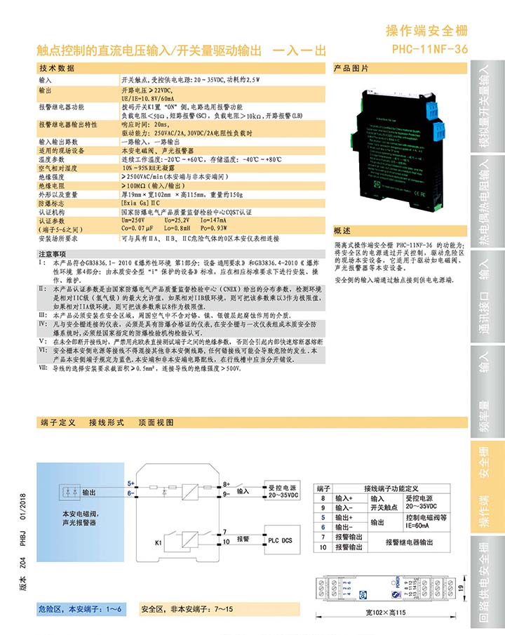 隔离式操作端安全栅 PHC-11NF-36的功能为,将安全区的电源通过开关控制,驱动危险区的现场本安设备,它适用于驱动如电磁阀、声光报警器等本安设备。 安全区的输入端通过触点接到供电电源端。